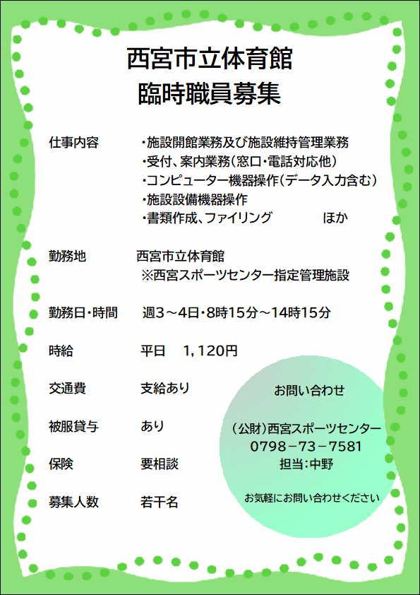 勤務地 西宮市立体育館(西宮スポーツセンター指定管理施設)